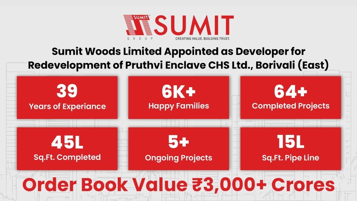 Mumbai (Maharashtra) [India], December 17:  Sumit Woods Limited, a legacy name in real estate, has been officially appointed as the developer for the redevelopment of Pruthvi Enclave Co-operative Housing Society Ltd., located in Borivali (East).